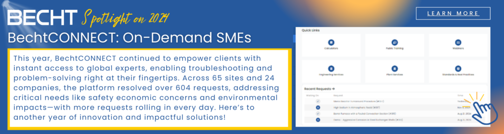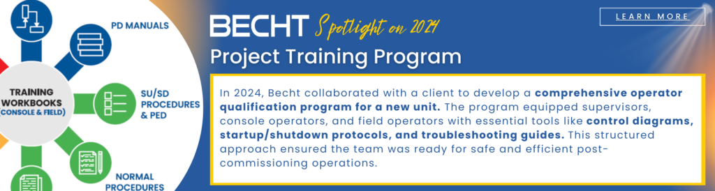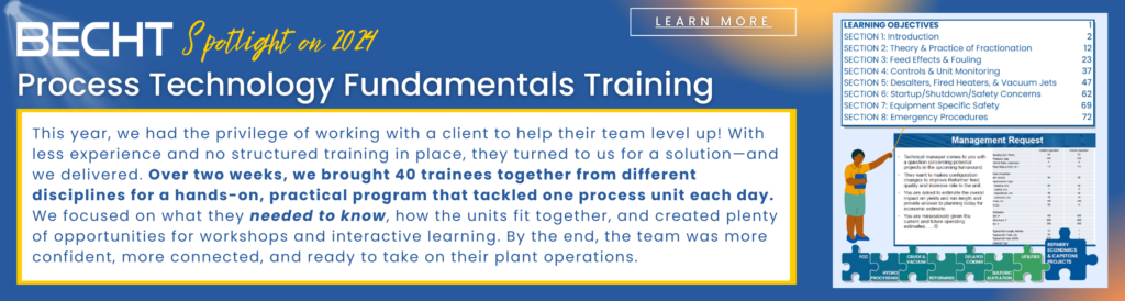 Ready to take action? Becht offers a comprehensive suite of training programs tailored to the process and energy industries, designed to enhance your team’s skills and competencies. Explore our training catalog or contact us directly.