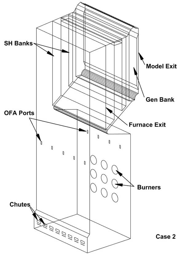 • All the coal burners are modified to include a large gas nozzle for burning natural gas only. A new OFA port system is added, and the grate stoichiometry is reduced compared to Case 1. The furnace excess air is 18% for this case.