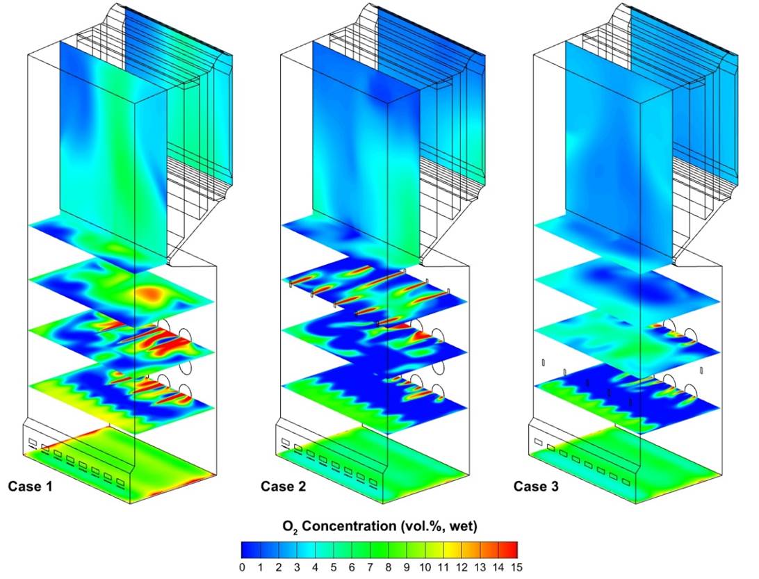 The above example demonstrates that CFD simulations can be used to optimize boiler performance by evaluating different design modifications. CFD modeling allows for the analysis of the effects of changing boiler configurations and operating conditions such as the arrangement of OFA ports and the furnace excess air levels on key performance metrics like emissions, gas species concentration distributions, and particulate carryover. In addition to design optimization, CFD modeling is also valuable for troubleshooting existing boiler systems. By comparing simulation results for the existing conditions and potential modifications, performance issues can be diagnosed, and targeted changes can be proposed to improve overall boiler efficiency.