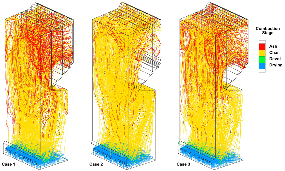 Figure 4: Particle Trajectories Colored by Combustion Stages (Used with Permission from B&W).