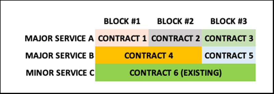 In this case, major services were allocated based on the contracting plan’s opportunities and constraints. A standing site contractor will provide the minor service throughout the facility.