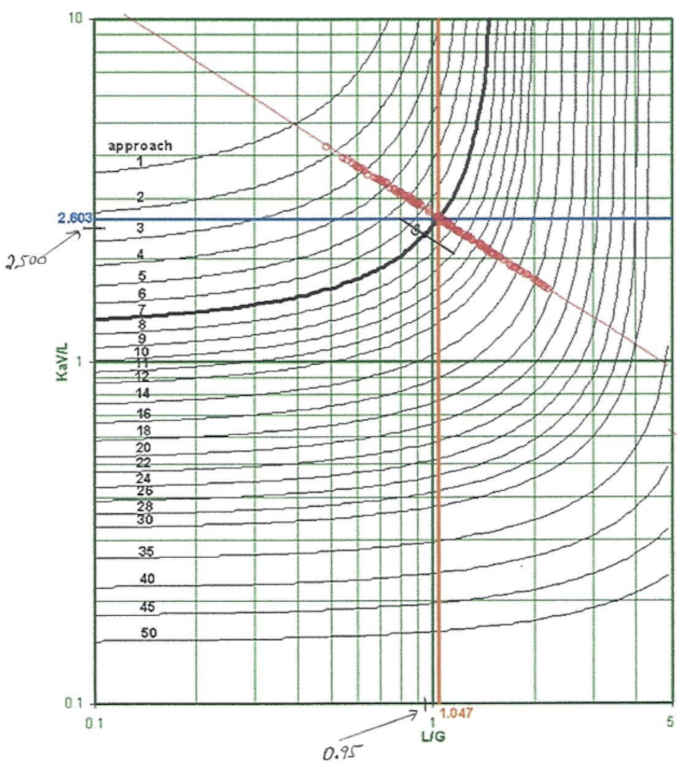 The test L/G is determined from the water flow rate and fan horsepower at the time of the test. Let us assume that the result gave an L/G of 0.90. The test KaV/L is obtained by numerical integration (the method will not be described here but is illustrated in ATC-105). The result is a KaV/L of 2.500. These two coordinates are plotted as shown below in Figure 2.