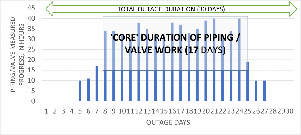 - As a ‘reality-check’, the team also calculated the same piping and valve work productivity during the more recent outage of a different processing unit. The numbers were quite comparable.