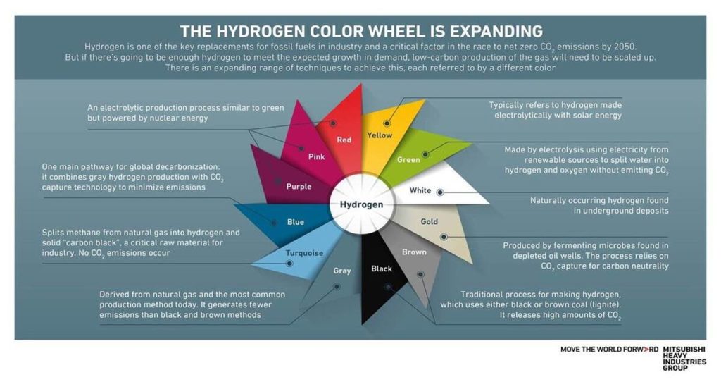 Mitsubishi Heavy Industries Group on their MHI Global site provides a simplistic graphic (3) of the colors currently being used in various industry reports, articles, webinars and presentations associated with H2 related topics.