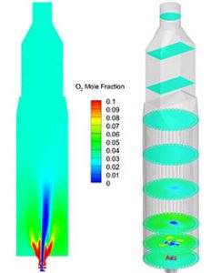 Figure 2 below shows the oxygen concentration distributions on different planes. The oxygen concentration is relatively uniform in the region above the mid-height of the radiation section of the heater, which indicates adequate mixing between the fuels and the air in the heater, leading to complete combustion of the fuels and carbon monoxide burnout.