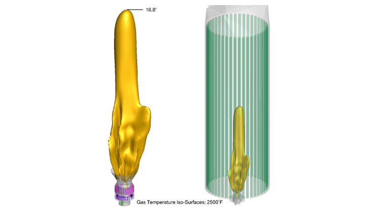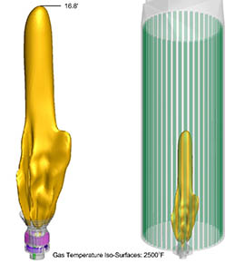 Figure 1 below shows the iso-surfaces of the gas temperature at 2500°F. The burner flame is predicted to be attached and stable. The flame length is approximately 17′ based on a gas temperature of 2500°F.