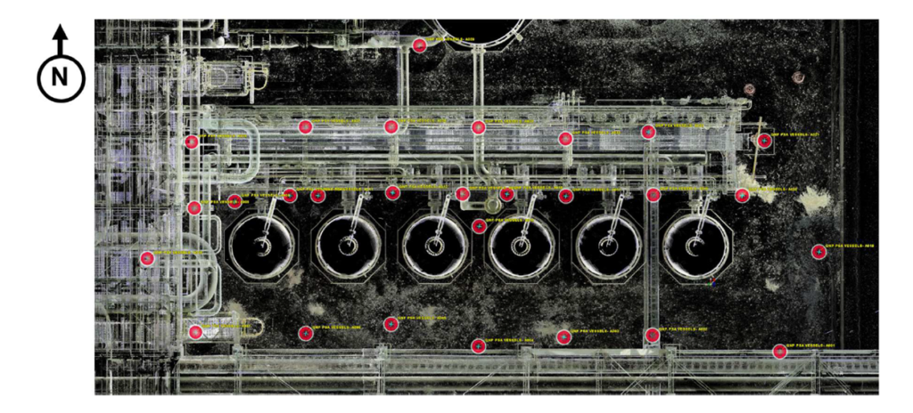 Another more recent method involves using laser scanning to obtain a 3D topographical map of the scanned surfaces. The scans are carried out from various locations to capture entire surfaces of interest. An example of a scan map for 6 PSA vessels from 28 different scan locations is shown in Figure 2.