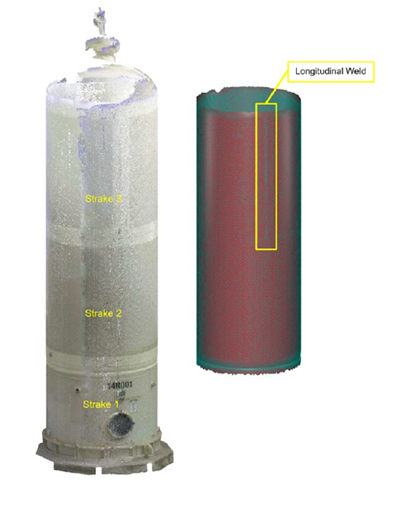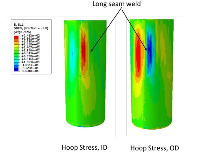 The laser scan data, collected as point cloud data, can be imported into a Finite Element Analysis (FEA) package with minor data manipulation. Laser scanning captures a map of the surface, including peaking, ovality, and misalignment, which is then automatically factored into the FEA and therefore the effects of peaking are directly derived by reviewing the stress analysis results, as shown in Figure 3. The stress on both the inside and outside of the vessels is automatically calculated and the subsequent bending stress due to the anomalies can be derived directly from the FEA.