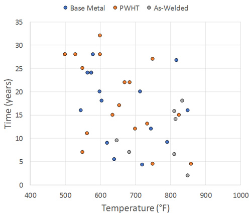 As discussed in the last section, calibration is based on as-welded, PWHT and base metal conditions, which correspond to different WRS levels (100%, 30% and 0%, respectively) and for the as-welded case, an increased dislocation density in the low temperature creep term. From review of the background data, all as-welded failures were crack-like and occurred in the weldment region (typically the HAZ). An example of such is case is shown in Figure 3. Interestingly, a number of PWHT failures also occurred in HAZ and were crack-like; API RP 941 points 27, 39, 46 and 62 as well as file points 13, 15 and 17 are likely examples. For the remaining 11 (out of 18) PWHT cases the damage was noted as being well away from welds, and for these cases 0% WRS was assumed.
