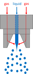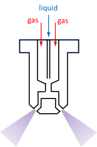 - For cases in which the nozzle is located in a superheated environment for the liquid feed, the assisting gas can provide cooling, thereby eliminating choking in the nozzle internals due to premature flashing.
