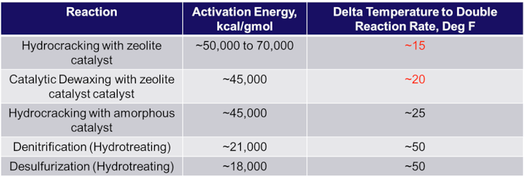 Since hydroprocessing reactions are exothermic, a temperature excursion can occur when heat is not removed as fast as it is created in the reactor. A temperature increase of 15°F (8°C) indicates that something significant is happening in a reactor that requires attention before the excursion turns into a runaway reaction. One of the reasons that we use 15°F as a key number is that it takes an increase of about 15°F to double the hydrocracking reaction rate when zeolite catalysts are employed (see Table 1 below). At any rate, an increase in reactor temperatures of 15°F is significant in any hydroprocessing unit.
