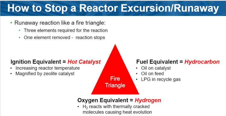 We’ll use the fire triangle shown below as an analogy – if we remove one leg of the triangle, the reaction will stop. Obviously, removing hydrogen is the only feasible leg of the “excursion triangle” that can be easily and quickly removed.